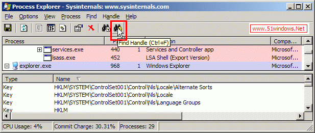 打開procexp.exe,按下面提示打開Find Handle