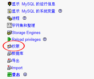 1、進(jìn)入你的phpmyadmin頁(yè)面后,點(diǎn)權(quán)限,如圖: