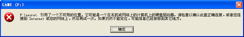 F:\secret. 引用了一個(gè)不可用的位置。它可能是一個(gè)在本機(jī)或網(wǎng)絡(luò)上的計(jì)算機(jī)上的硬盤(pán)驅(qū)動(dòng)器。請(qǐng)檢查以確認(rèn)此盤(pán)正確連接,或者您連接到Internet或您的網(wǎng)絡(luò)上,然后再試一次。如果仍然不能定位,可能信息已經(jīng)被移到其它地方。