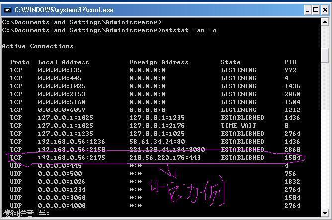 例如:TCP 192.168.0.56:2150 221.130.44.194:8080 ESTABLISHED 2860