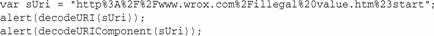 在這個(gè)例子中,變量uri存放的是用encodeURIComponent()編碼的字符串。生成的值說(shuō)明了應(yīng)用兩個(gè)解碼方法時(shí)會(huì)發(fā)生的事情。第一個(gè)值由decodeURI()輸出,把%20替換成空格。第二個(gè)值由decodeURIComponent()輸出,替換所有的特殊。