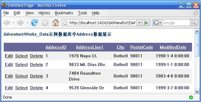 圖1 使用GridView控件展示VS2005示例數(shù)據(jù)庫Address表格中的數(shù)據(jù)