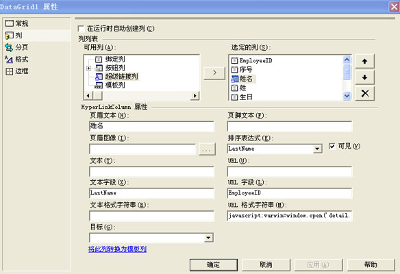 (3) 在"可用列"選項框中,選擇"超級鏈接列"并單擊"添加"按鈕。如下圖進行添加超級鏈接列的設(shè)置。