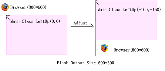 圖2展示的是Flash主類的坐標(biāo)值與stage寬高的關(guān)系,這里的調(diào)整是將Flash主類的左上角始終貼齊當(dāng)前Flash Player的左上角,無(wú)論尺寸如何變化.
