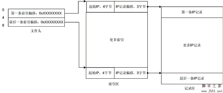 再來說一下索引區(qū)的存儲結(jié)構(gòu),它存儲了很多條索引,每條索引的格式為7個字節(jié),前四個字節(jié)表示的是一個IP段的起始字節(jié),后三個字節(jié)是鏈接到以這個起始IP開始的IP段內(nèi)的所有IP記錄的地址,也就是說它是一個絕對地址,用于到鏈接到記錄區(qū)查詢國家,地區(qū)的數(shù)據(jù)。