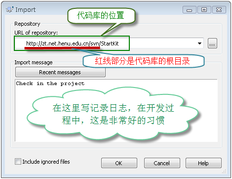 點(diǎn)擊Import,彈出下面的窗體,其中http://zt.net.henu.edu.cn 是服務(wù)器名,svn是代碼倉(cāng)庫的根目錄,StartKit是我們?cè)谏蟼€(gè)教程中添加的一個(gè)代碼庫: