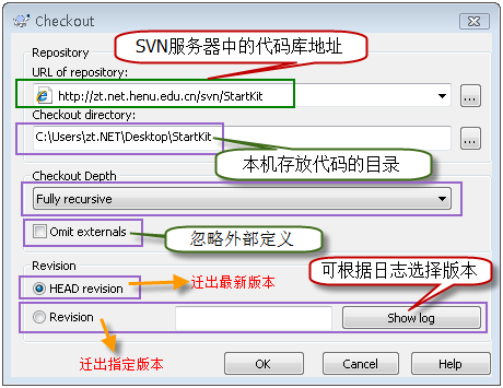 說明:上圖中的Checkout Depth,有4個(gè)選項(xiàng),分別是遷出全部、只簽出下一級(jí)子目錄和文件、只簽出文件、只簽出空項(xiàng)目,默認(rèn)的是第一項(xiàng)。上面的例子中,我們也可以使用web的方式訪問代碼庫,在瀏覽器中輸入http://zt.net.henu.edu.cn/svn/StartKit/