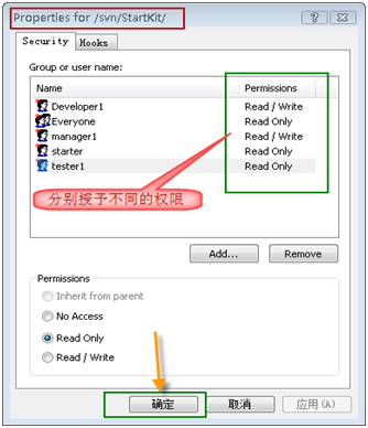 點(diǎn)擊"確定"按鈕,上面的用戶就具有了訪問StartKit代碼庫的不同權(quán)限。