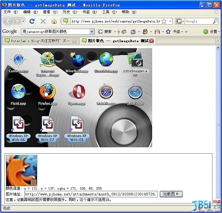 舜子這里也寫了一個簡單的 getImageData 的演示 圖片取色演示。這個演示目前只能在ff3下運行。
