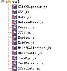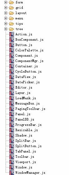 底層API(core):底層API中提供了對(duì)DOM操作、查詢的封裝、事件處理、DOM查詢器等基礎(chǔ)的功能。其它控件都是建立在這些底層api的基礎(chǔ)上,底層api位于源代碼目錄的core子目錄中,包括DomHelper.js、Element.js等文件,如圖xx所示。