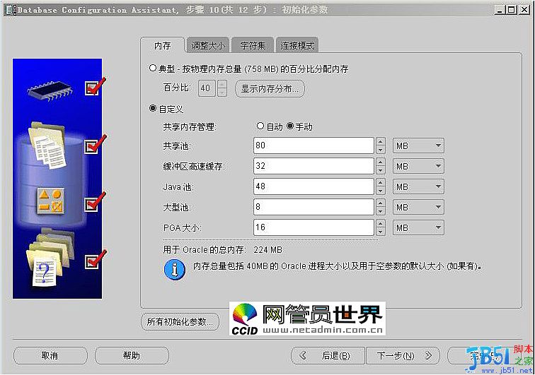 單擊“下一步”,會出現(xiàn)“初始化參數(shù)”對話框,該對話框用配置初始化參數(shù)、數(shù)據(jù)庫字符集和連接模式。如圖12: