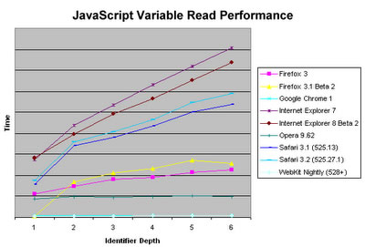 和上個測試一樣,Internet Explorer和Firefox還是最慢的,Opera表現(xiàn)了非常搶眼的性能,而同樣的,Chrome和最新版本的Webkit午夜版顯示了和作用域深度無關(guān)的性能趨勢,同樣需要注意的是,F(xiàn)irefox 3.1 Beta 2的變量訪問時間還是會伴隨著深度出現(xiàn)一個奇怪的跳躍。