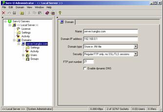 下載Serv-U應(yīng)用程序后,執(zhí)行ServU4004.exe,并根據(jù)提示逐步安裝。安裝完成后不需要重新啟動(dòng)計(jì)算機(jī),用戶就可以直接選擇“開始”→“程序”→“Serv-U FTP Server”→“Serv-U Administrator”命令啟動(dòng)應(yīng)用程序,并進(jìn)行簡(jiǎn)單設(shè)置。下面我們以當(dāng)前計(jì)算機(jī)(IP地址為192.168.0.1,域名為server.kangbo.com)為例,建立FTP服務(wù)器。