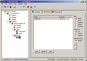 (6) 在管理器左邊的窗格中選擇Anonymous用戶,再在右邊窗格切換到Dir Access選項(xiàng)卡,然后單擊Add按鈕,將C:\Wang目錄增加到列表中。