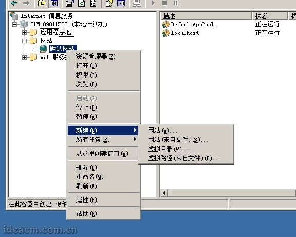 3.6.2、首先打開Internet 信息服務(wù)(IIS)管理器,點(diǎn)擊“+”展開目錄樹,再展開網(wǎng)站,在默認(rèn)網(wǎng)站上點(diǎn)擊鼠標(biāo)右鍵-新建-虛擬目錄。【圖六十一所示】
