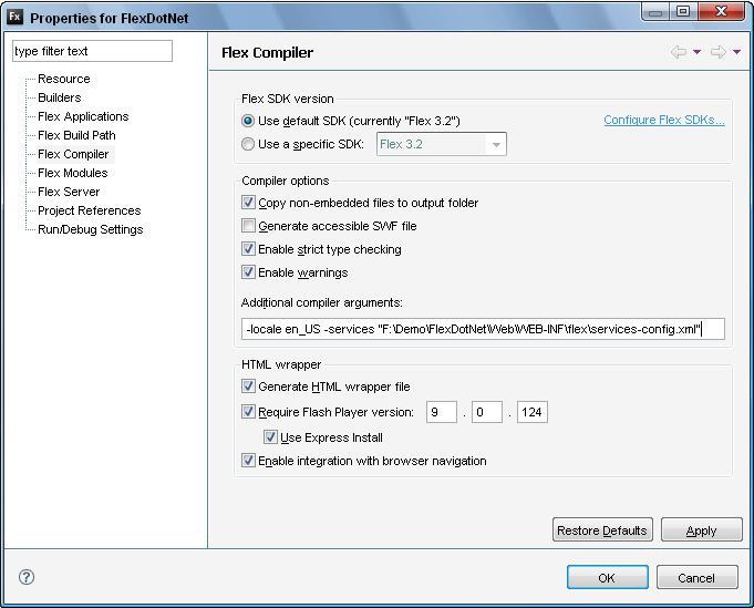 Flex項(xiàng)目創(chuàng)建完畢,下面在通過一些相應(yīng)的配置就可以通過FluorineFx和.NET通信了。開發(fā)項(xiàng)目屬性設(shè)置面板,設(shè)置其Flex Compiler為下圖所示(-services的配置也可以設(shè)置為相對路徑):