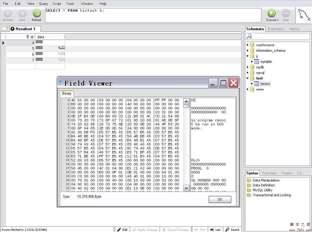 在DBMS中線要?jiǎng)?chuàng)建數(shù)據(jù)庫(kù)test,table bintest,data字段數(shù)據(jù)類型用LONGBLOB即可測(cè)試