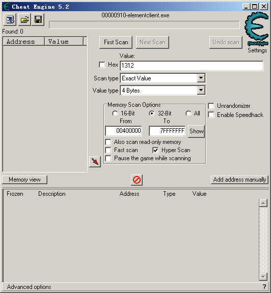 如上圖,我的是1312點血,好的,用CE搜"1312",.用"Exact Value"方式,4字節(jié)