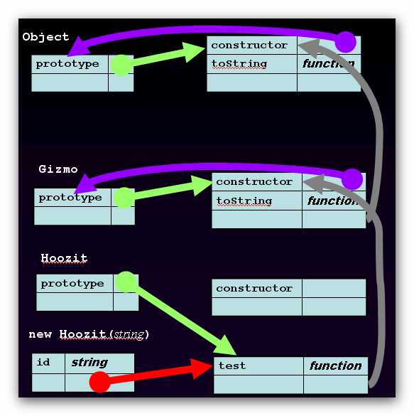 根據(jù)文章開頭的那段英文,我們知道每個函數(shù)都有一個原型,這個原型是個對象,并且對象里面包含一個constructor屬性。其中Object,Gizmo,Hoozit就是函數(shù),可以看出里面都有一個prototype項,而這個prototype又指向一個對象,這個對象里面又有一個constructor屬性,constructor又指回自身。