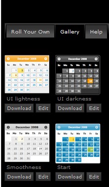 如上圖,在網(wǎng)頁的左側(cè)的tab欄上單擊Gallery選項,便會在下方列出Jquery官方提供的皮膚,點擊任意一套皮膚下面的Edit便會跳到Rool Your Own,在你選中的皮膚基礎(chǔ)上便可定制出自己想要的皮膚,定制過程是所見即所得,所有用起來很方便,定制完后,點擊Rool Your Own下方的Download theme跳到下載頁面,