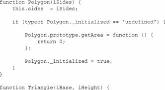 上面的代碼展示了用動(dòng)態(tài)原型定義的Polygon和Triangle類。錯(cuò)誤在于突出顯示的設(shè)置Triangle.prototype屬性的代碼。從邏輯上講,這個(gè)位置是正確的,但從功能上講,卻是無(wú)效的。從技術(shù)上說(shuō)來(lái),在代碼運(yùn)行前,對(duì)象已被實(shí)例化,并與原始的prototype對(duì)象聯(lián)系在一起了。雖然用極晚綁定可使對(duì)原型對(duì)象的修改正確地反映出來(lái),但替換prototype對(duì)象卻不會(huì)對(duì)該對(duì)象產(chǎn)生任何影響。只有未來(lái)的對(duì)象實(shí)例才會(huì)反映出這種改變,這就使第一個(gè)實(shí)例變得不正確。