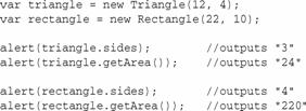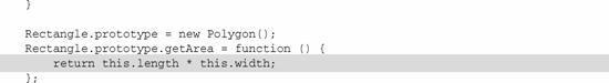 注意,Rectangle構(gòu)造函數(shù)不把sides作為參數(shù),同樣的,常量4被直接傳給Polygon構(gòu)造函數(shù)。與Triangle相似,Rectangle引入了兩個(gè)新的作為構(gòu)造函數(shù)的參數(shù)的屬性,然后覆蓋getArea()方法。