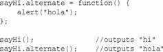 這里,方法alternate()實(shí)際上是函數(shù)sayHi的方法。可以像調(diào)用常規(guī)函數(shù)一樣調(diào)用sayHi()輸出"hi",也可以調(diào)用sayHi.alternate()輸出"hola"。即使如此,alternate()也是sayHi()公用作用域中的方法,而不是靜態(tài)方法。