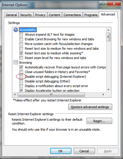 2. 默認(rèn)情況下,IE是將腳本調(diào)試支持功能關(guān)閉的,因此你需要顯示地打開它。打開IE,點(diǎn)擊“工具”—“Internet 選項(xiàng)”,在“Internet 選項(xiàng)”里面選擇高級(jí)頁簽,在“設(shè)置”列表里面,找到“禁用腳本調(diào)試(Internet Explorer)”選項(xiàng),它默認(rèn)是勾選上的—將它勾掉。