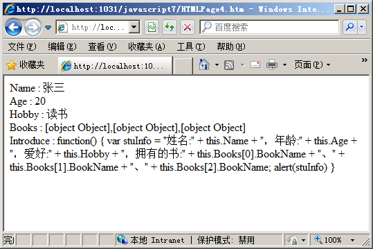 ",年齡:" + student.Age + ",愛好:" + student.Hobby + ",擁有的書:" + student.Books[0].BookName + "、" + student.Books[1].BookName + "、" +student.Books[2].BookName;
