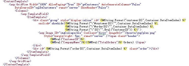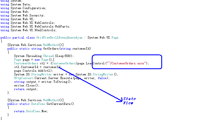 第一個圖的顯示是個Gridview,當(dāng)點擊每條記錄前面的'+'時會使用jQuery的ajax功能調(diào)用一個Web Method,并傳輸一個當(dāng)前產(chǎn)品的ID進去,然后會定義一個繼承UserControl的類,它能夠添加一個ascx文件,然后這個類里面定義一個View State的字段。