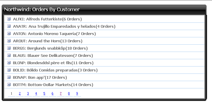 使用northwind的數(shù)據(jù)。點擊前面的加號會把其它屬于這個產(chǎn)品的詳細(xì)訂單展示出來,而每個產(chǎn)品后面都會有它的訂單個數(shù)。點擊'+'后的樣子: