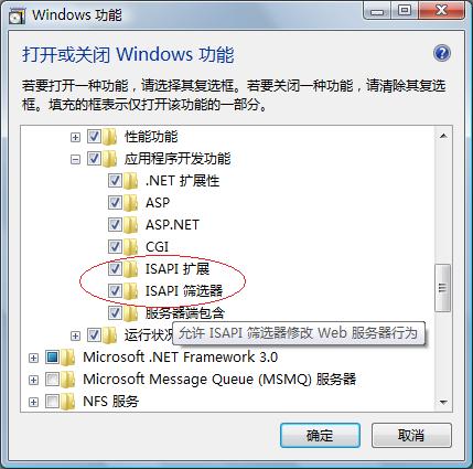 還要確認(rèn)一點(diǎn),在Vista的“打開或關(guān)閉Windows功能”里不但要安裝IIS,而且還要安裝兩個(gè)重要的ISAPI組件,如下圖: