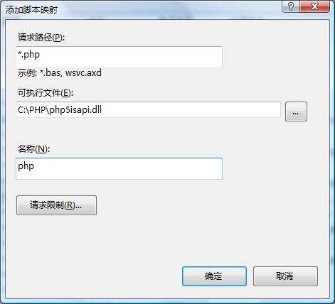 7、在“處理程序映射”里右鍵“添加腳本映射”,請(qǐng)求路徑填*.php,可執(zhí)行文件還選c:\php\php5ispai.dll,名稱還叫php。