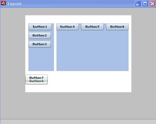 <?xml version="1.0" encoding="utf-8"?> <mx:WindowedApplication xmlns:mx="http://www.adobe.com/2006/mxml"> <mx:Canvas width="340" height="247" backgroundColor="#FFFFFF"> <mx:VBox id="vb" left="10" right="248" y="26" height="153" backgroundColor="#A9C0E7"> <mx:Button label="button1" width="74"/> <mx:Button label="Button2"/> <mx:Button label="Button3"/> </mx:VBox> <mx:HBox id="hBox2" left="100" right="27" y="26" height="153" backgroundColor="#A9C0E7"> <mx:Button label="button4" /> <mx:Button label="Button5"/> <mx:Button label="Button6"/> </mx:HBox> <mx:Button label="Button8" y="200"/> <mx:Button label="Button7" y="190"/> </mx:Canvas>