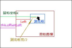由圖像可以得知left=鼠標x - this.offsetLeft - 瀏覽框寬/2,所以跟據(jù)該幾何思想可以得出而代碼,而top的值也是根據(jù)一樣的道理所得,這里就不做詳細解釋了.