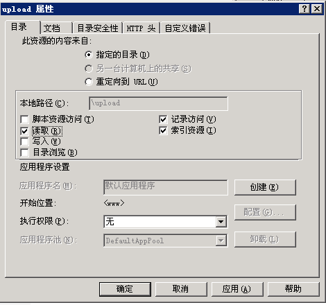 對付上傳,我們可以總結(jié)為:可以上傳的目錄不給執(zhí)行權(quán)限,可以執(zhí)行的目錄不給上傳權(quán)限。Web程序是通過IIS用戶運(yùn)行的,我們只要給IIS用戶一個特定的上傳目錄有寫入權(quán)限,然后又把這個目錄的腳本執(zhí)行權(quán)限去掉,就可以防止入侵者通過上傳獲得webshell了。配置方法:首先在IIS的web目錄中,打開權(quán)限選項卡、只給IIS用戶讀取和列出目錄權(quán)限,然后進(jìn)入上傳文件保存和存放數(shù)據(jù)庫的目錄,給IIS用戶加上寫入權(quán)限,最后在這兩個目錄的“屬性”—“執(zhí)行權(quán)限”選項把“純腳本”改為“無”即可。見下圖