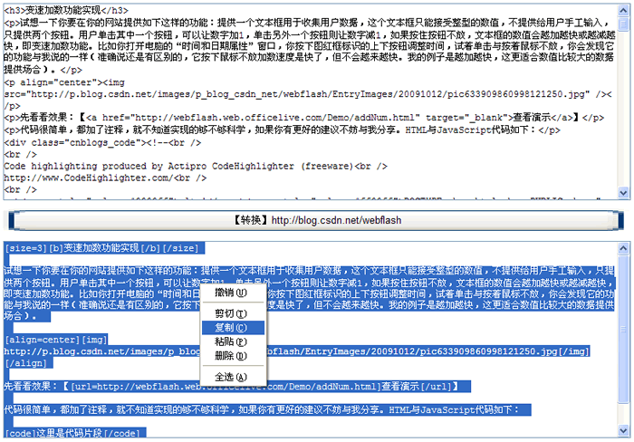 工具的使用方法是(參考下面附圖):復(fù)制你發(fā)布到博客之前自己編輯好的HTML代碼放于上文本框,然后再點擊中間的“轉(zhuǎn)換”按鈕,這樣工具就會在下面文本框生成你要粘貼到論壇的UBB文本,同時目標(biāo)代碼處于選中狀態(tài),你復(fù)制即可。