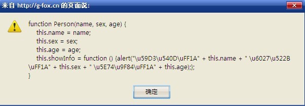 alert("姓名:" + this.name + " 性別:" + this.sex + " 年齡:" + this.age);