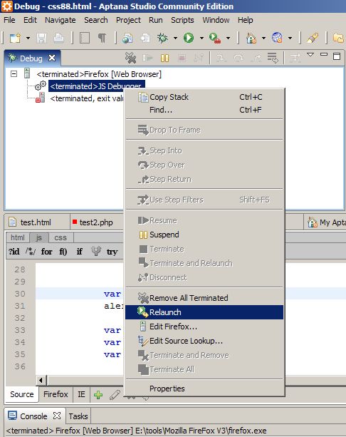 點擊 “Debug” 按鈕進(jìn)入調(diào)試視圖,(aptana 同時會打開firefox瀏覽器),如下圖: