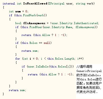 由于HttpApplication::AuthorizeRequest事件是在HttpApplication::AuthenticateRequest事件之后執(zhí)行的(請(qǐng)看我提到過(guò)的事件列表), 在前面介紹的AuthenticateRequest事件中我們修改了Context.User對(duì)象,而且加入了角色信息,所以AuthorizeRequest事件在驗(yàn)證用戶(hù)的權(quán)限時(shí)發(fā)現(xiàn)Context.User對(duì)象中什么都有,所以它才允許用戶(hù)訪問(wèn)請(qǐng)求的資源,否則請(qǐng)求將被返回到指定的頁(yè)面.以上就是ASP.NET1.1的原理,怎么樣你理解了嗎?