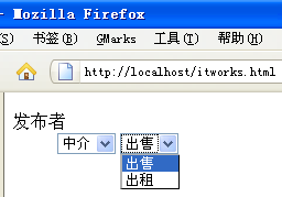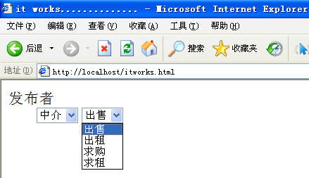 想實現(xiàn)一個很簡單的功能:當(dāng)選中“中介”時,不顯示“求購”與“求租”。本以為通過display:none即可實現(xiàn),結(jié)果發(fā)現(xiàn)在option元素上使用display:none在firefox中有效,在IE6、IE7、IE8中都無效。