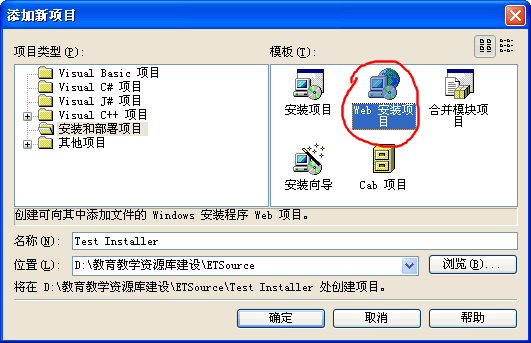 2. 在“添加新項目”對話框中,選擇“項目類型”窗格中的“安裝和部署項目”,然后選擇“模板”窗格中的“Web 安裝項目”。在“名稱”框中鍵入 Test Installer。(圖1-3)