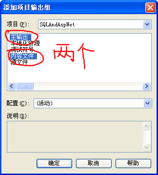 2. 在“添加項目輸出組”對話框中,選擇“項目”下拉列表中的“SQLANDASPNet”。