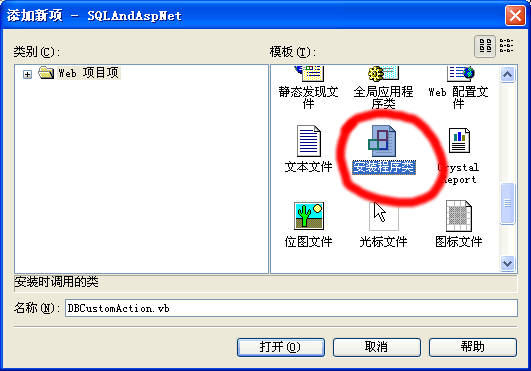 5. 在“添加新項”對話框中選擇“安裝程序類”。在“名稱”框中鍵入 DBCustomAction。