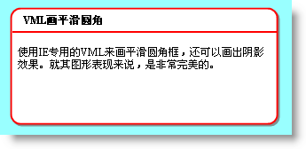 使用IE專用的VML來畫平滑圓角框,還可以畫出陰影效果。就其圖形表現(xiàn)來說,是非常完美的。