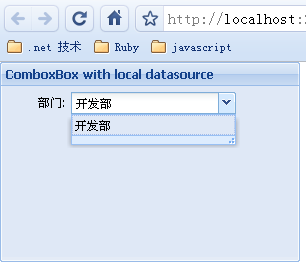 這是一個(gè)重量級(jí)的控件,因?yàn)樗趯?shí)際應(yīng)用中起著廣泛而重要的作用。雖然它的使用頻率沒有TextField高,但是它的功能卻比TestField豐富的多,所以把它放在比較靠后的位置來(lái)介紹。Extjs的ComboBox具有下拉提示,自動(dòng)完成等功能,也同時(shí)支持本地和服務(wù)器端的數(shù)據(jù)源。下面先看一個(gè)本地?cái)?shù)據(jù)源的示例。