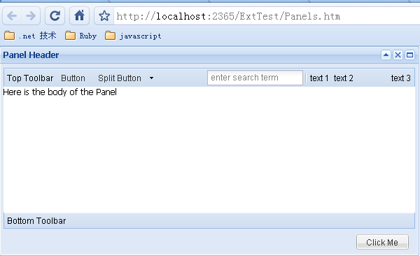 contentEl: 'panelcontent'表示這個(gè)panel要加載id為panelcontent的div中的內(nèi)容,也就是一個(gè)Label和一個(gè)button。效果如下: