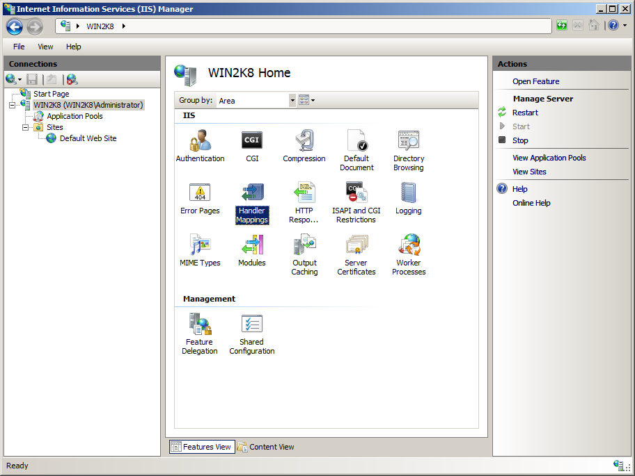 下面,回到IIS上,打開IIS控制臺(tái),在左邊樹中選最頂級(jí)結(jié)點(diǎn),也就是你的電腦名,然后在中間(功能視圖)里打開“Handler Mappings”(中文叫“處理程序映射”),如下圖: