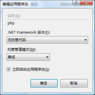 4、打開(kāi)Vista管理工具中的“Internet信息服務(wù)(IIS)管理器”,在“應(yīng)用程序池”中新建一個(gè)應(yīng)用程序池,取名為PHP,.Net版本為“無(wú)托管代碼”。